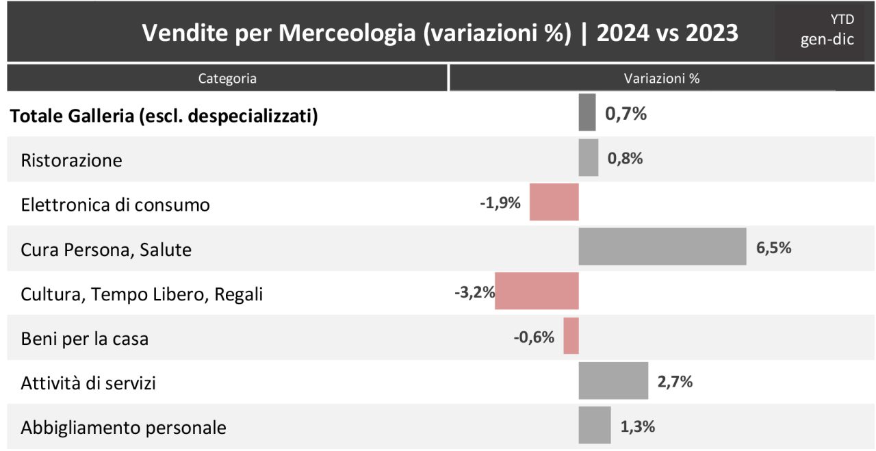 Marco Daviddi, Strategy and Transactions Markets Leader Europe West di EYcommenta:“Il 2024 ha confermato i segnali positivi già osservati nel 2023, con una ripresa significativa nella seconda metà dell’anno che ha trainato le vendite e gli ingressi, compensando un inizio più lento. Questo cambio di tendenza riflette un miglioramento del clima di fiducia dei consumatori e la solidità del format del centro commerciale. In particolare, il segmento della Cura Persona e Salute ha registrato una crescita notevole (+6,5%), dimostrando la capacità del settore di adattarsi e innovare per rispondere alle nuove abitudini e bisogni dei consumatori”.