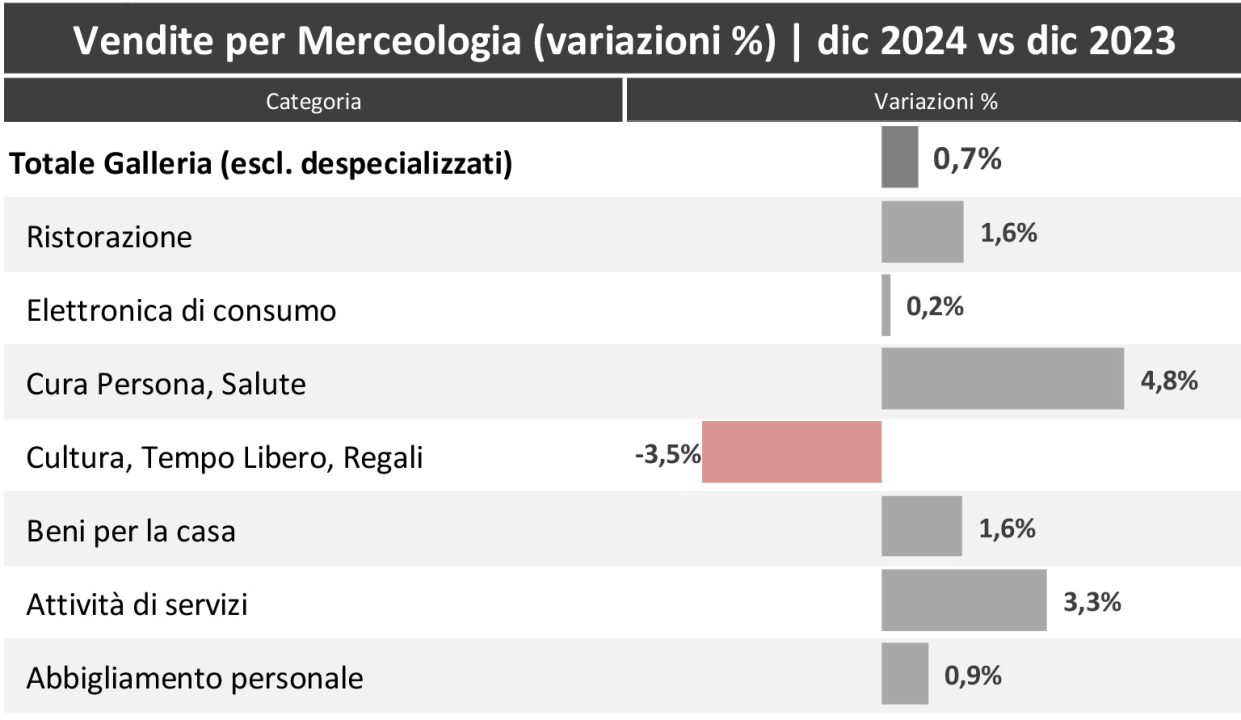 Infine, a dicembre 2024, tra i mesi più importanti per l’Industria grazie allo shopping natalizio, l’Osservatorio registra per le vendite un trend positivo (+0,7%) rispetto al 2023, quindi coerente con la media annua. A dicembre, inoltre, quasi tutte le categorie merceologiche hanno avuto andamenti positivi: la categoria Cura Persona e Salute si conferma la più dinamica con un +4,8%, seguita dall’Attività di servizi con un +3,3%. Trend positivi ma di minor entità anche per la Ristorazione (+1,6%), Beni per la casa (+1,6%), Abbigliamento (+0,9%) ed Elettronica di Consumo (+0,2%). Unico trend negativo per la categoria Cultura, Tempo Libero, Regali che, coerentemente con l’andamento annuale, chiude al -3,5%.
